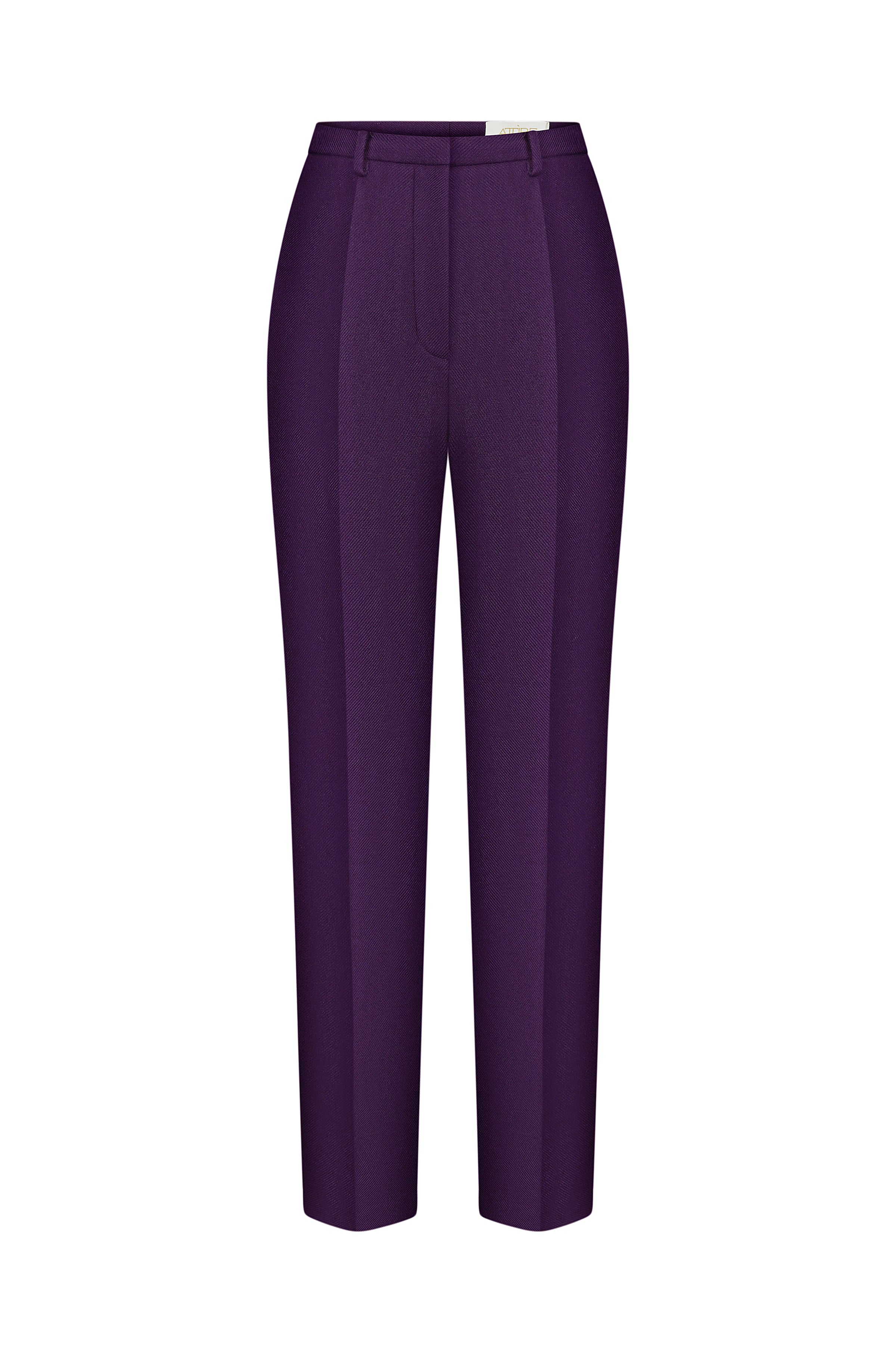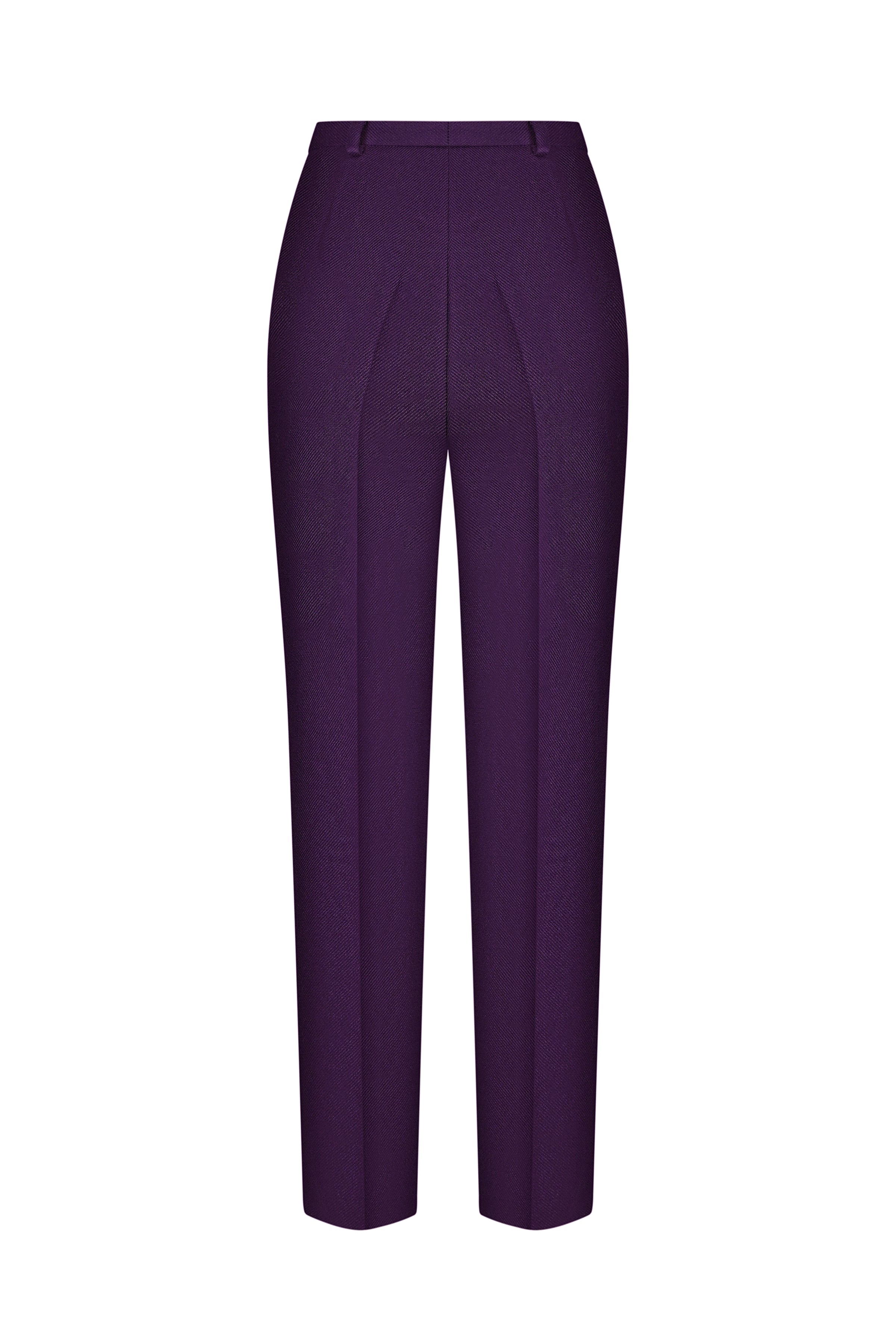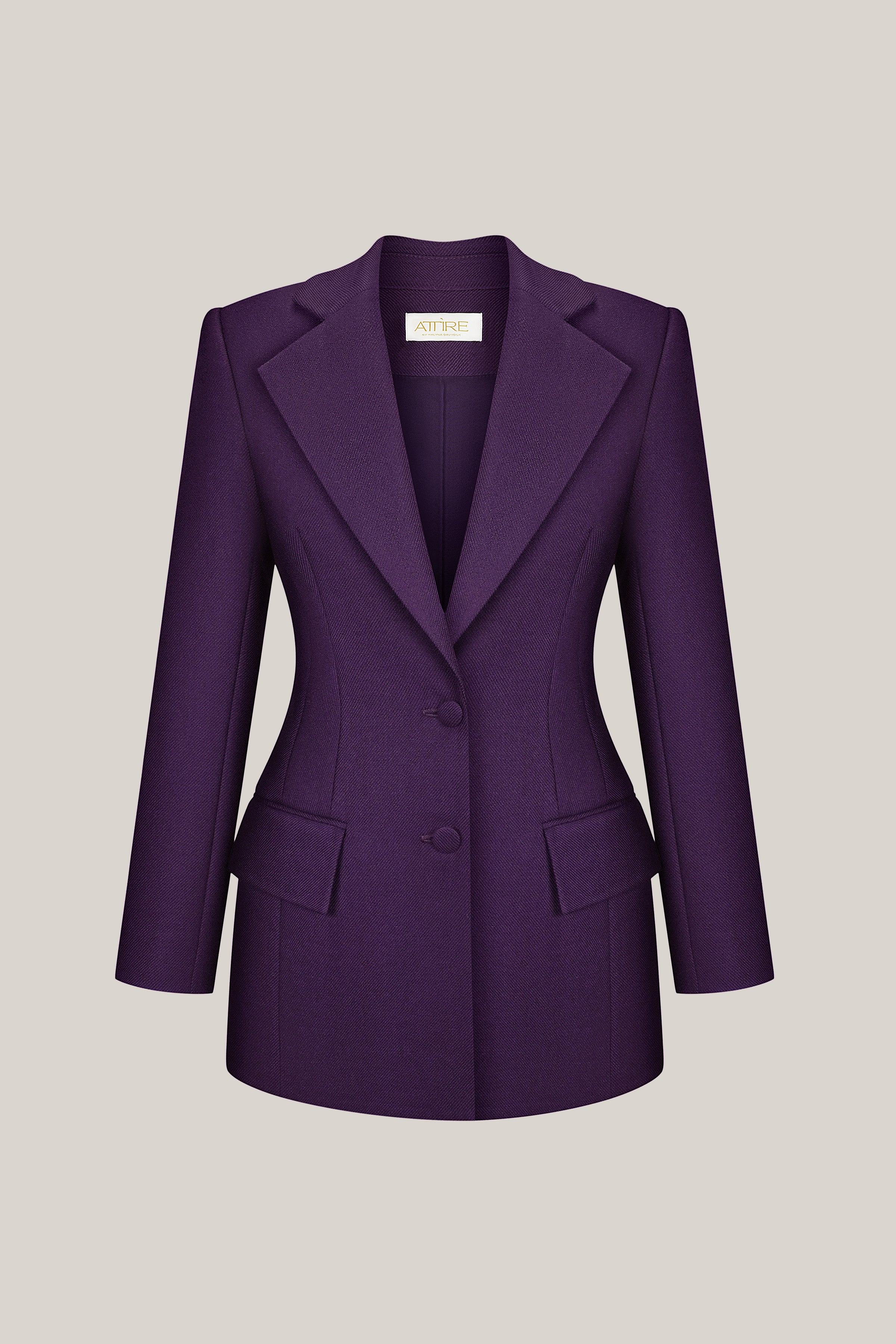 A modern suit made from natural wool in a rich ripe plum tone. The blazer features a tailored fit with defined shoulders and a sculptural silhouette. Dense wool twill adds structure and depth.