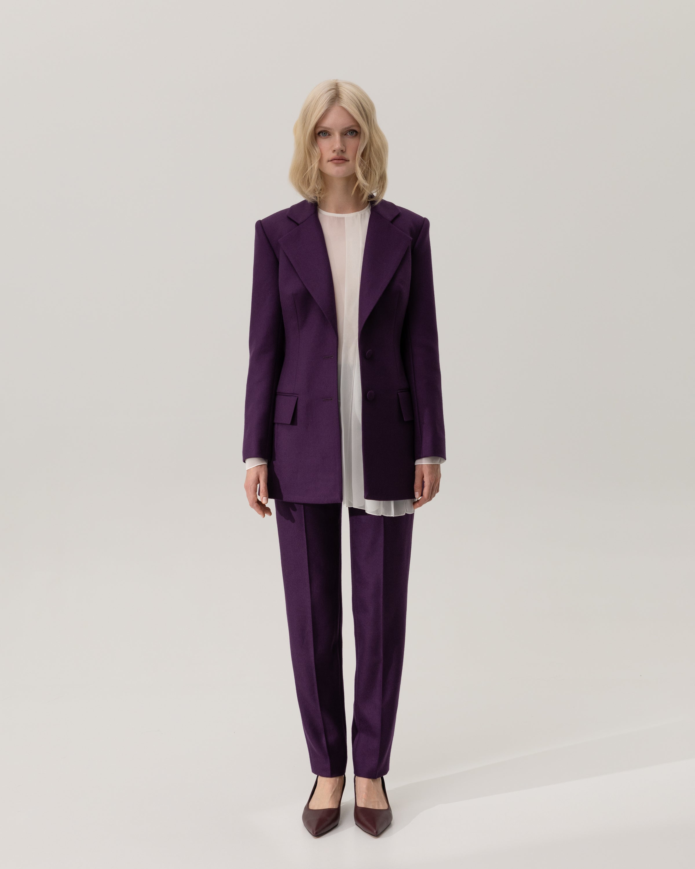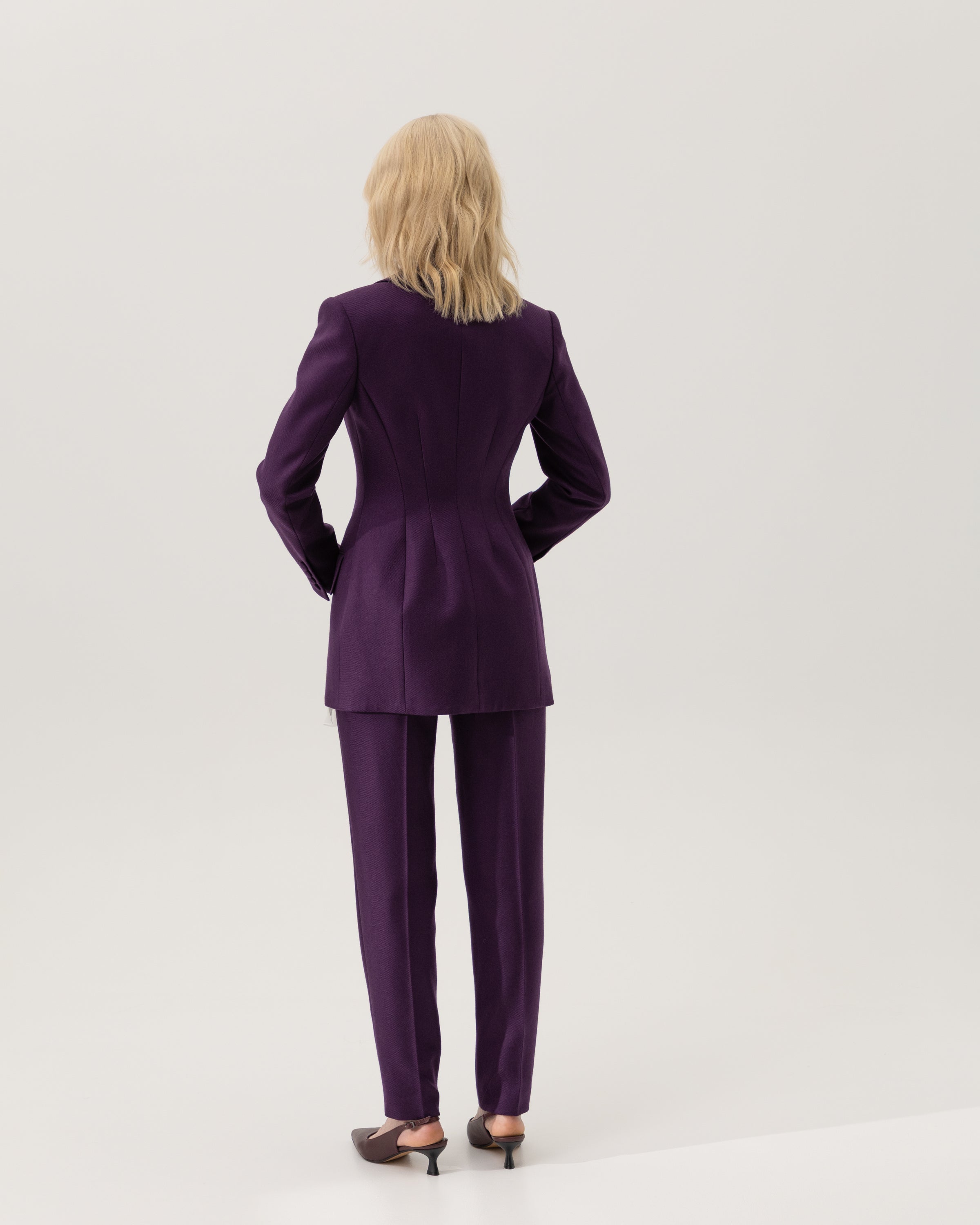 A modern take on the classic slim-fit trouser. Crafted from twill wool in a rich plum tone, these trousers combine refined tailoring with effortless comfort. Perfect worn alone or as part of a set with the matching jacket — for the woman who embraces minimalist elegance, thoughtful design, and premium fabrics.