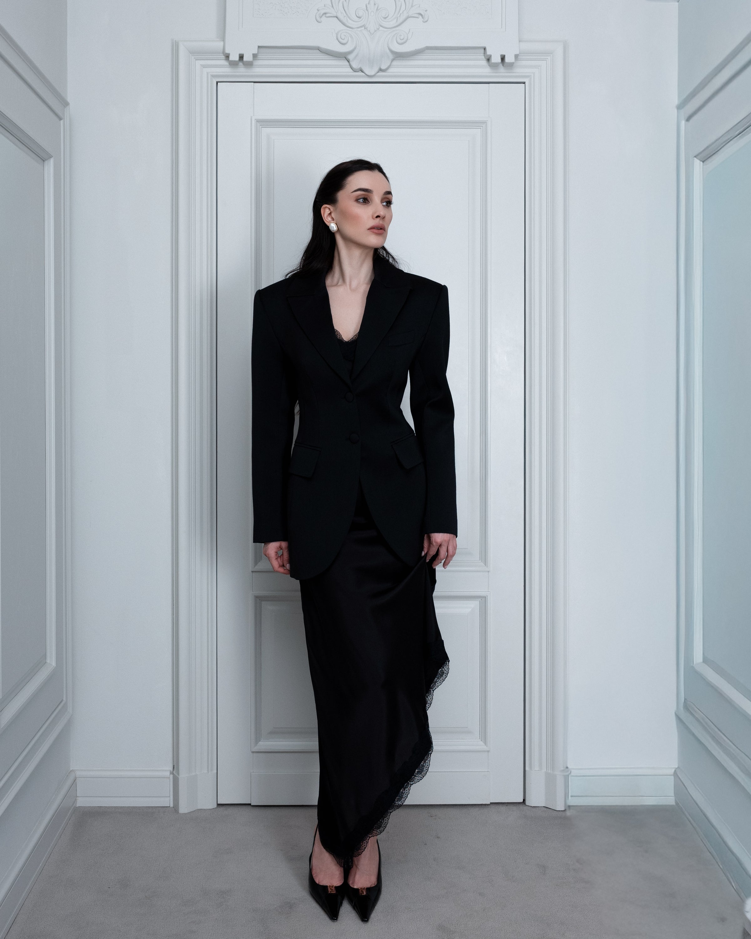 A wool-silk jacket with an accentuated waist — a refined foundation of a modern wardrobe.