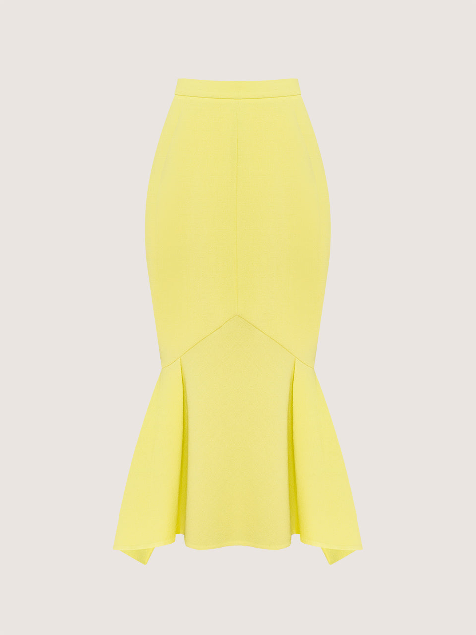 Create an elegant look with this midi skirt featuring an asymmetric hem, crafted from 100% crepe-woven wool. The understated yet stylish design without lining ensures comfort and ease of wear. This model perfectly combines classic aesthetics with modern accents, making it a versatile choice. The refined cut adds femininity and highlights the figure. Perfect for business meetings or special occasions.