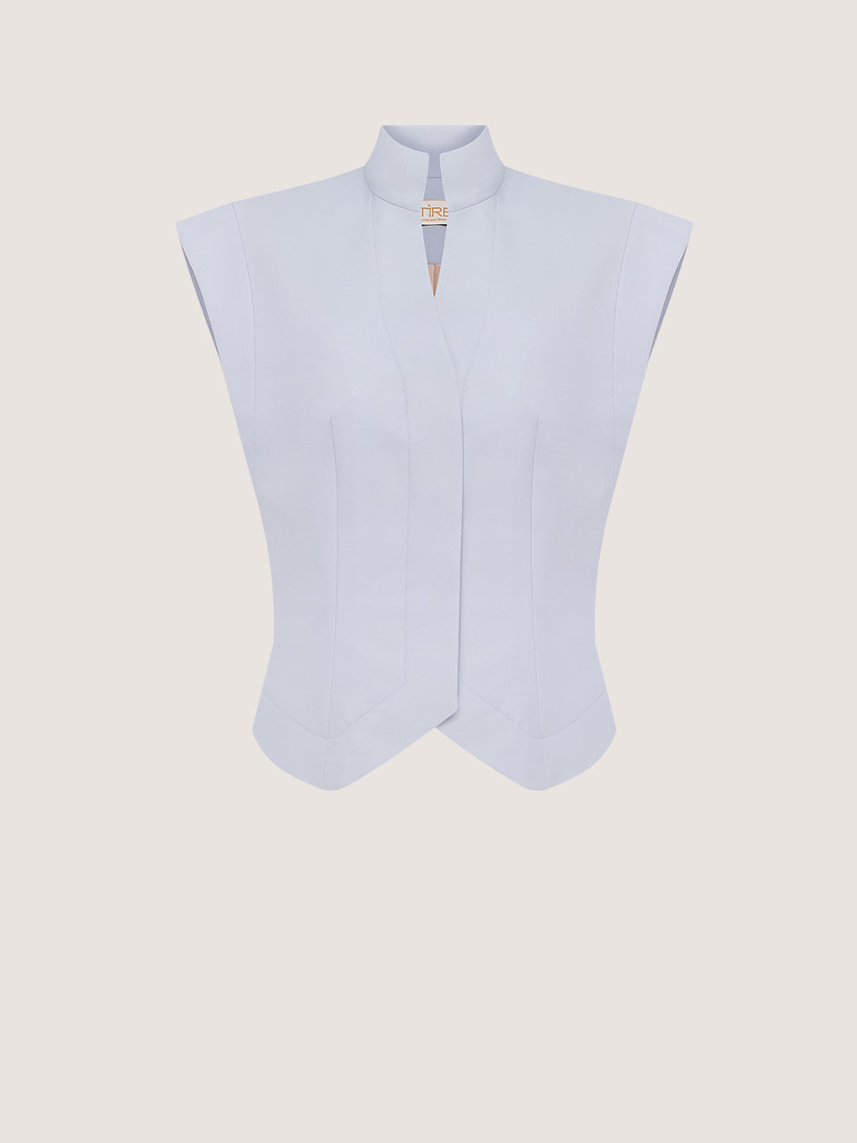Fitted vest with a stand collar. Made from lightweight suiting fabric with a lining, featuring a concealed closure. Presented in a soft blue shade. Easy to style and can be paired with matching trousers.