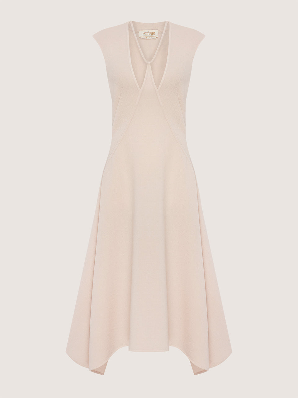Витончена сукня з натуральної тканини у теплому бежевому відтінку. М’який вовняний креп формує плавний архітектурний силует, що підкреслює жіночність та легкість. Геометрична лінія декольте додає сучасного акценту, а розкльошений низ дарує рух і повітряність. Втілення елегантного шику на основі натуральних тканин.
