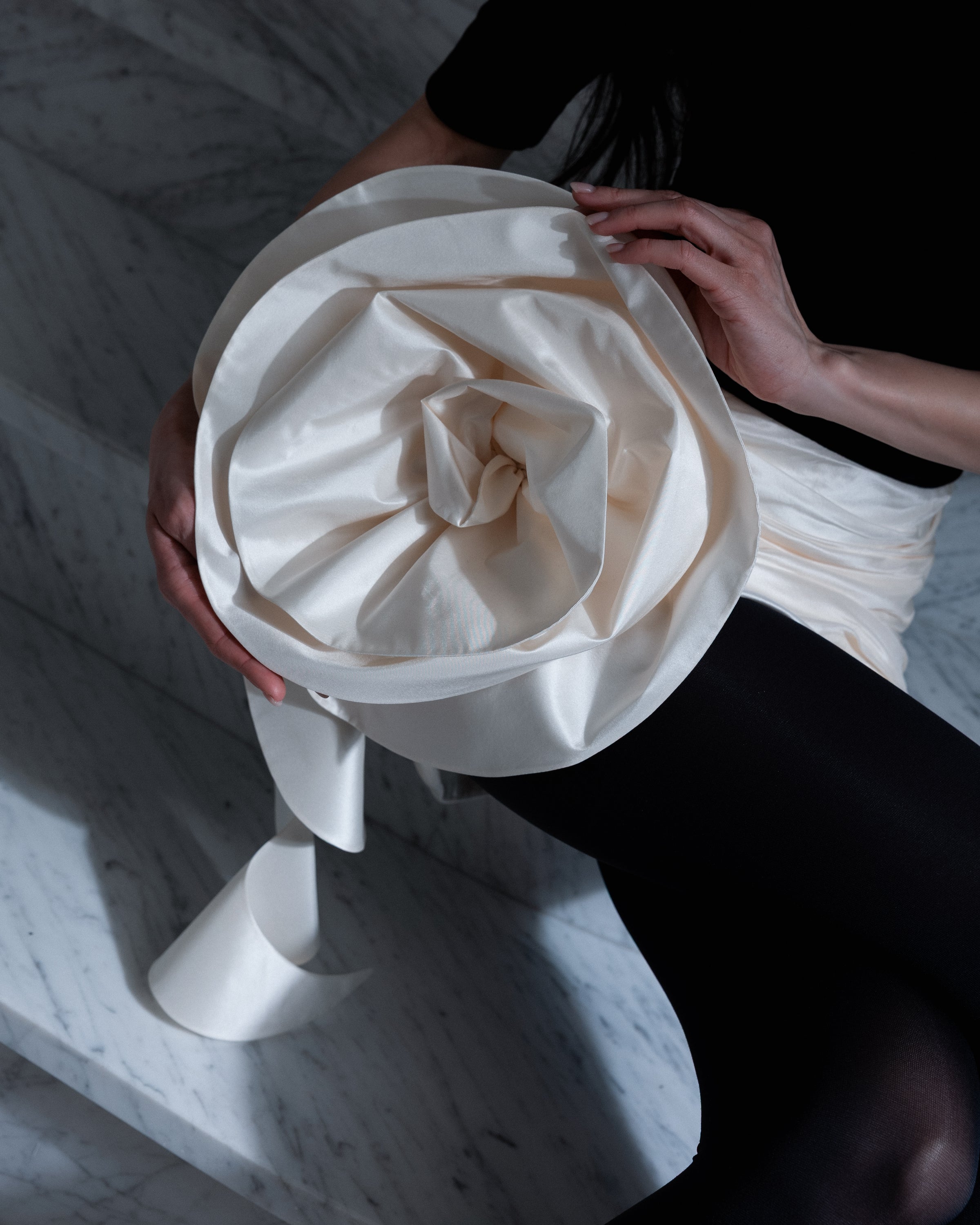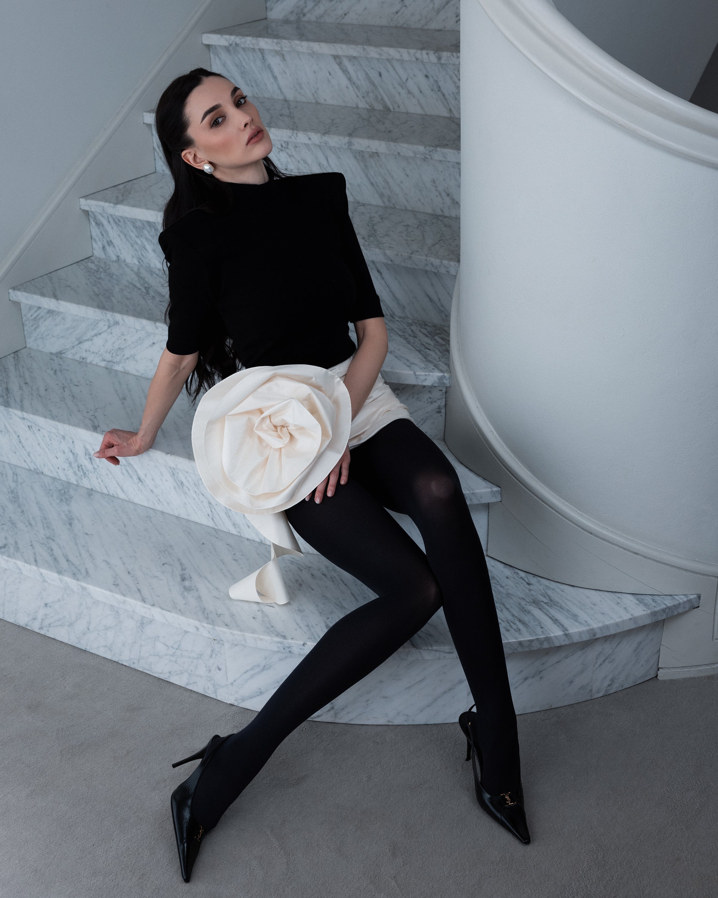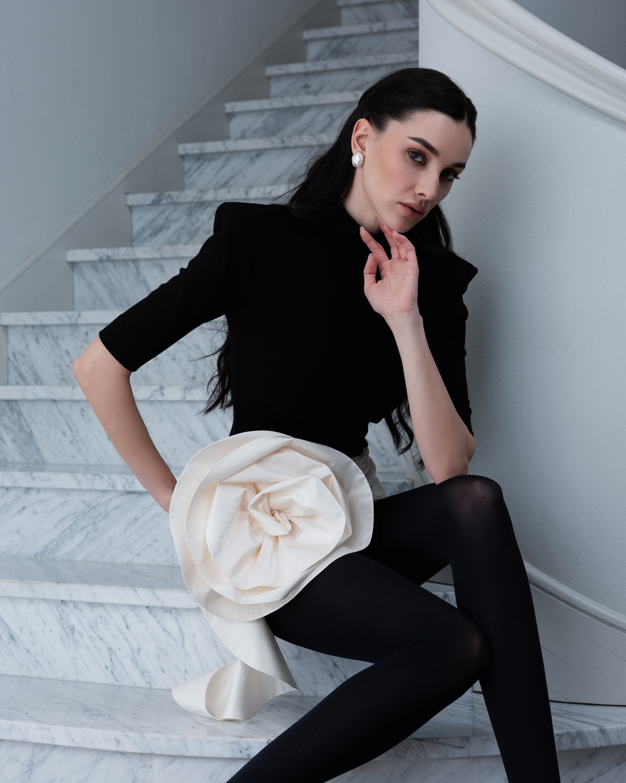 Спідниця з витонченим драпіруванням, доповнена акцентною декоративною квіткою. Виріб виконано з шовкової тафти — тканини, яка чудово тримає форму та створює виразні складки. Ця ефектна деталь додає образу особливого характеру. Спідниця ідеально поєднується з мінімалістичними топами та природно привертає до себе увагу.
